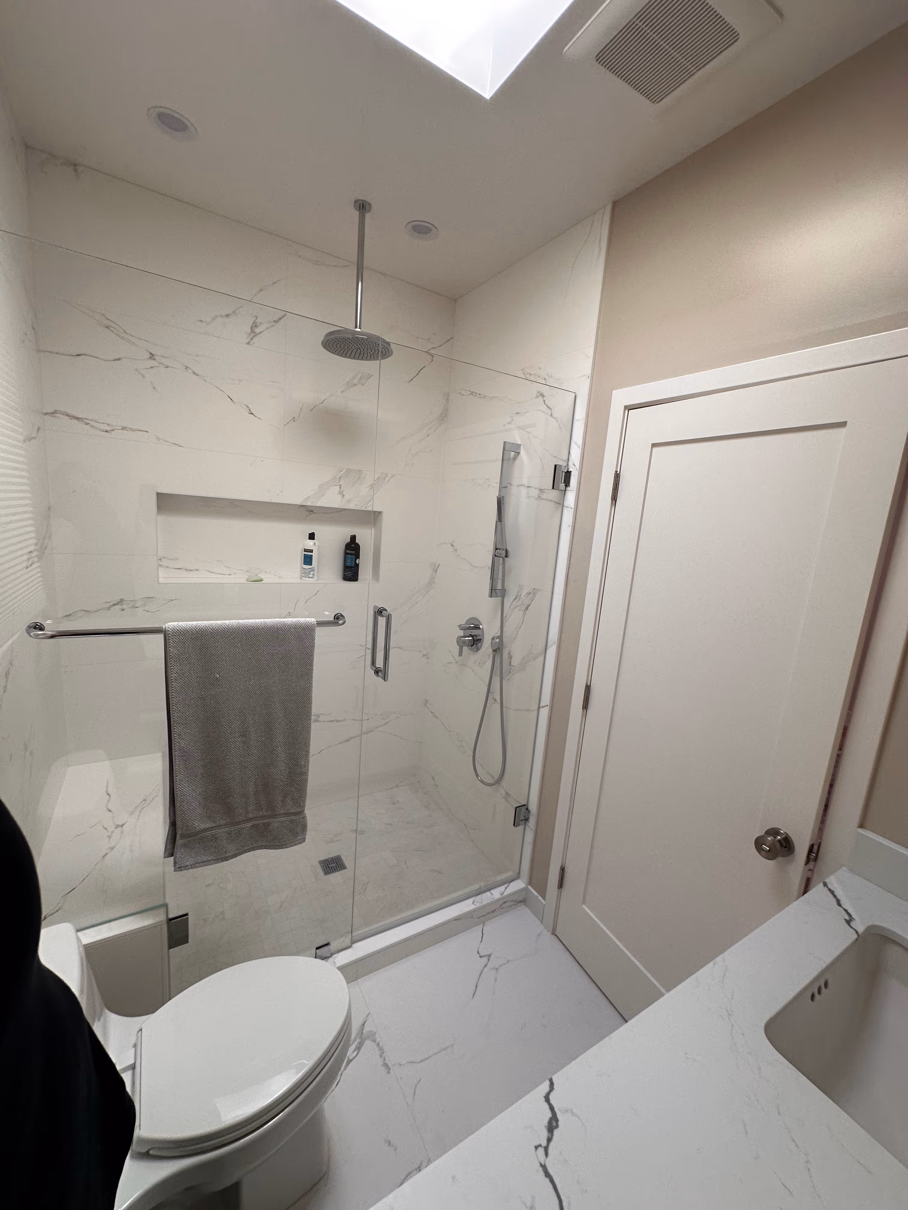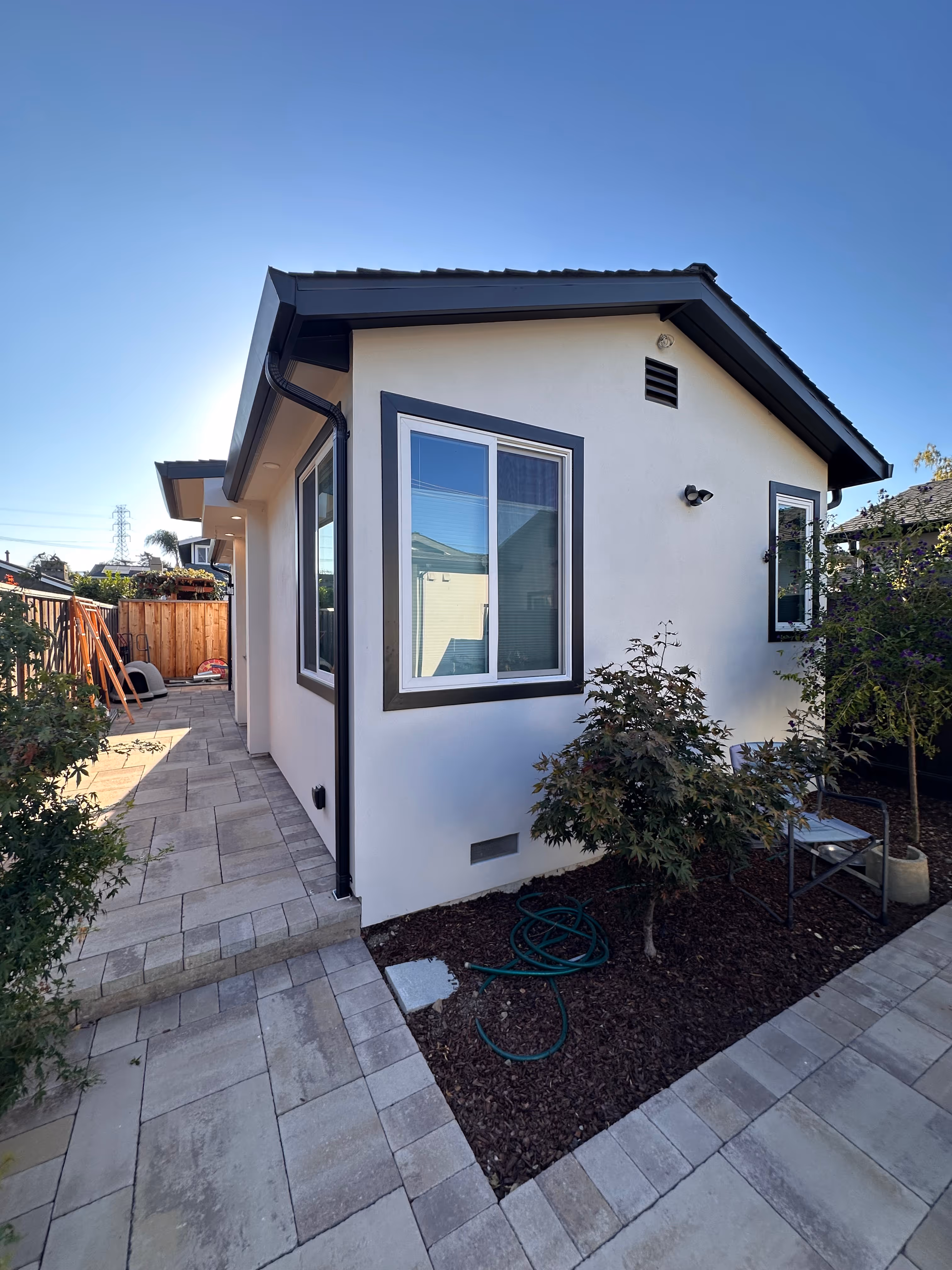 The Patels wanted a private space for visiting family that didn't feel like a cramped guest room. This 480 sq ft detached ADU delivers the feel of a boutique hotel just steps from the main house. The open-concept kitchen features a dramatic black granite waterfall island, white gloss cabinetry, and full-size stainless appliances—everything needed for extended stays. The spa-inspired bathroom includes floor-to-ceiling marble tile, a skylight-lit rain shower, and frameless glass enclosure. Outside, a new paver patio and drought-tolerant landscaping transformed the side yard into a welcoming outdoor space. Now when family visits, they have a home of their own—not just a room.
